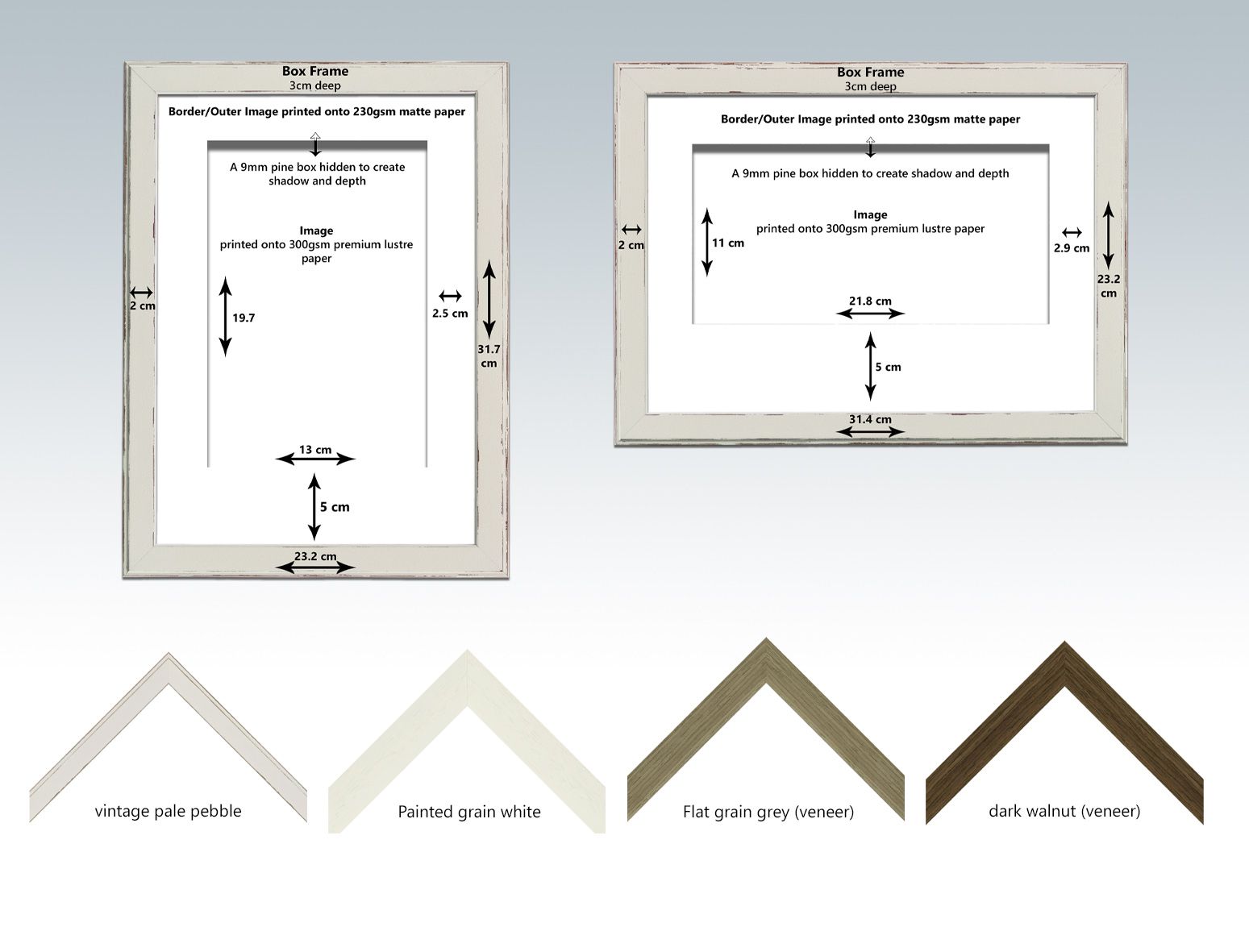The composite print of your choice framed within either vintage pale pebble, as seen in the illustration,